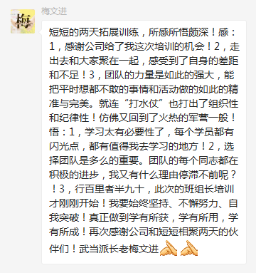 两天一晚的训练,34位参训者被分为“四大门派”,在丹霞湖醉人的初夏盛景及怡人的湖光山色中激烈鏖战并一决高下。培训外,大家还不断地在“交流学习群”中表达收获与感言并积极互动,更为高涨的学习热情增添了别样的“分享、沟通”之美。
